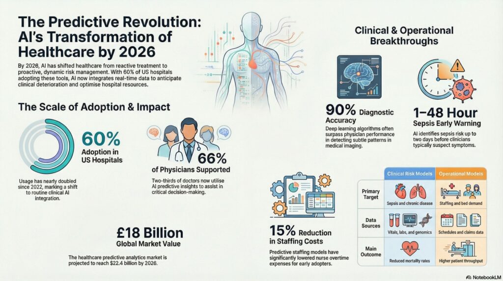 By 2026, nearly 60% of hospitals in the United States will have adopted at least one AI-assisted predictive tool in routine clinical care, up from approximately 35% in 2022. The global healthcare predictive analytics market is expected to reach $22.4 billion by 2026.